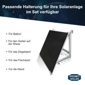 Mit unserem 1000W Balkonkraftwerk von Promit Solar erzeugen Sie umweltfreundlichen Strom direkt vor Ort. Dieses Set besteht aus vier leistungsstarken 250W Solarmodulen (1×1,15m) und einem 700W Wechselrichter, der den erzeugten Strom effizient in nutzbaren Haushaltsstrom umwandelt. Die Anlage ist rechtskonform mit der 800W-Regelung, einfach zu installieren und ermöglicht Ihnen, Ihre Stromkosten nachhaltig zu senken.