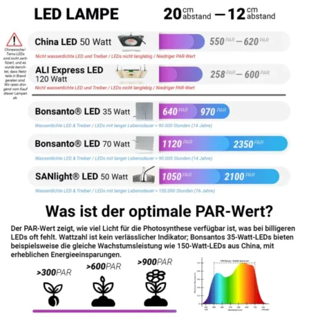 Die Güte einer LED-Lampe wird über den PAR-Wert (PPFD, μmol/(s·m²)) beschrieben.